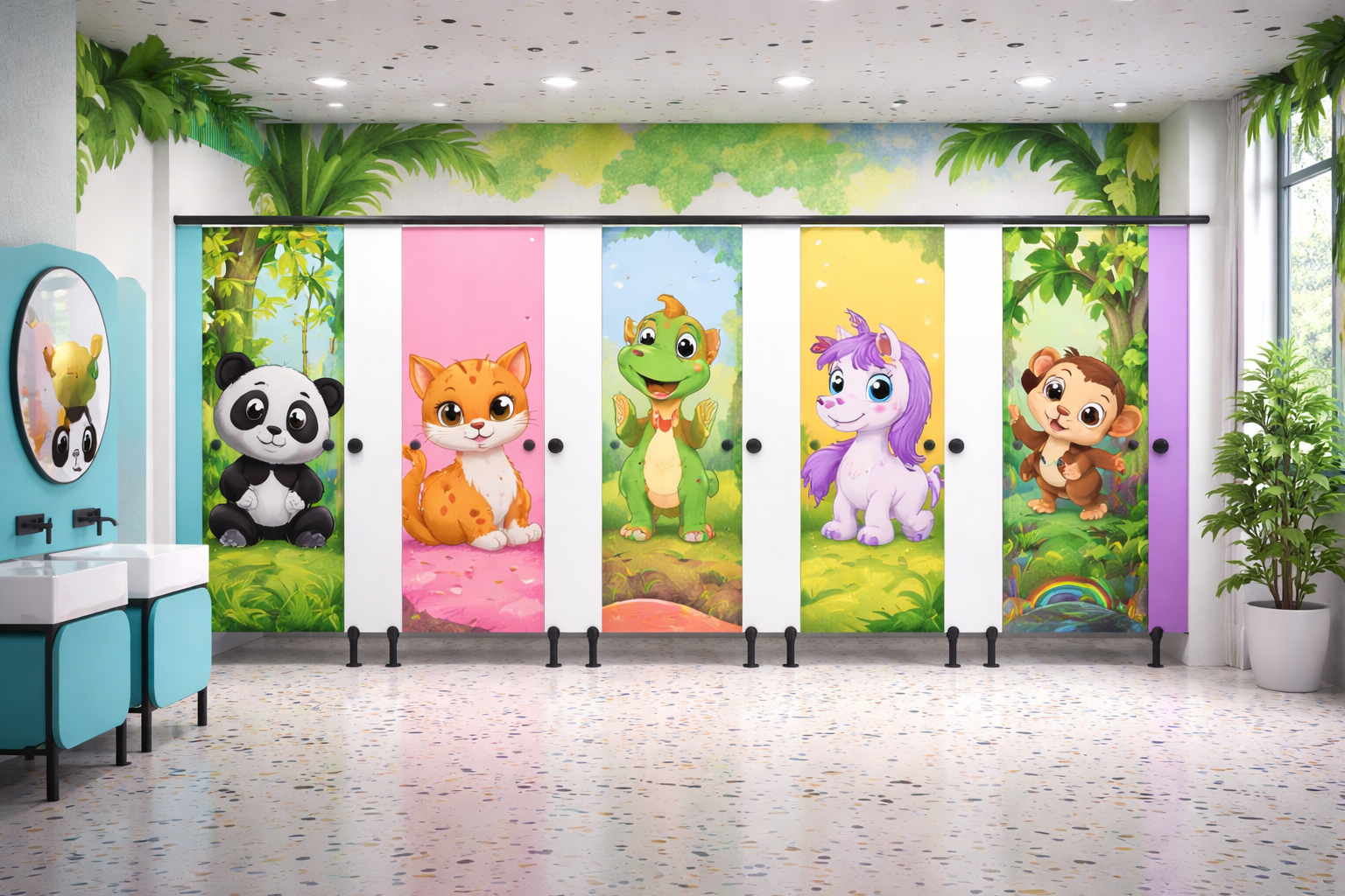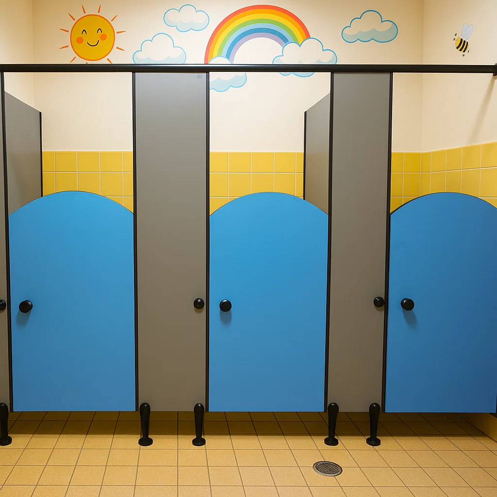 The intermediate panels (or partitions) are firmly fixed to the rear wall and mid-pilaster using aluminum U-channels, providing solid support. Each door is attached to a mid/end pilaster with three sturdy hinges while maintaining a floor clearance of 150 mm for easy cleaning.