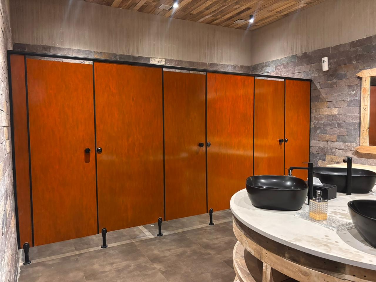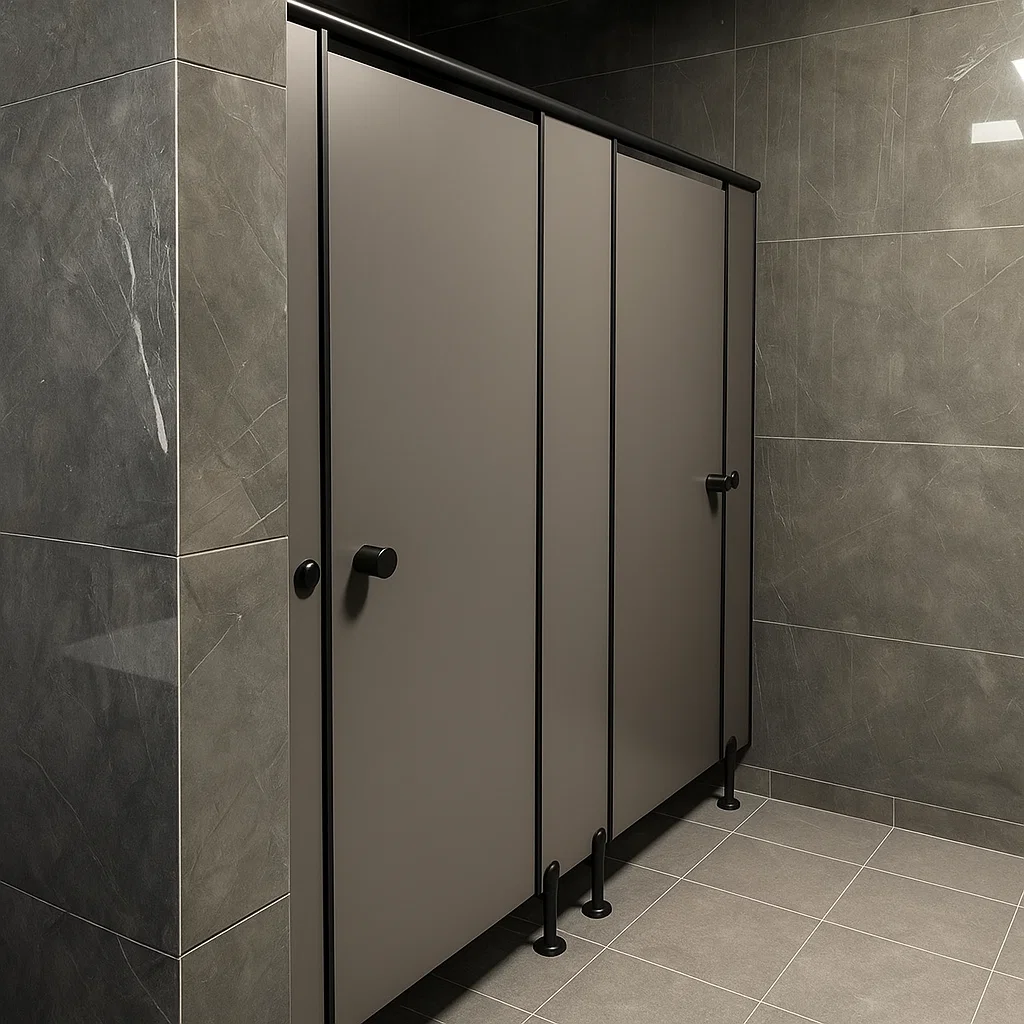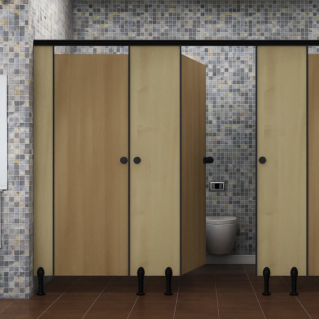 The intermediate panels, or partitions, are fixed to the rear wall and mid-pilaster through aluminium U-channels, providing sturdy support. Each door is mounted on a mid/end pilaster with 3 hinges while maintaining a floor clearance of 150 mm.
